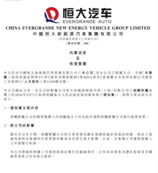 快科技 9 月 8 据报道,恒大汽车近日在港交所宣布,恒大恒驰新能源汽车(上海)有限公司附属公司个别债务人向有关地方人民法院申请破产清算相关附属公司。