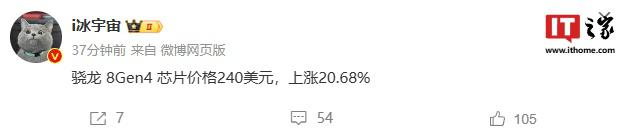 IT 世家 9 月 8 每日新闻,博主 @i 冰宇宙 今天在微博上分享一条新闻:骁龙 8 Gen 4 芯片价格 240 美金(IT 家族备注:目前的约定 1702 人民币),上涨 20.68%。