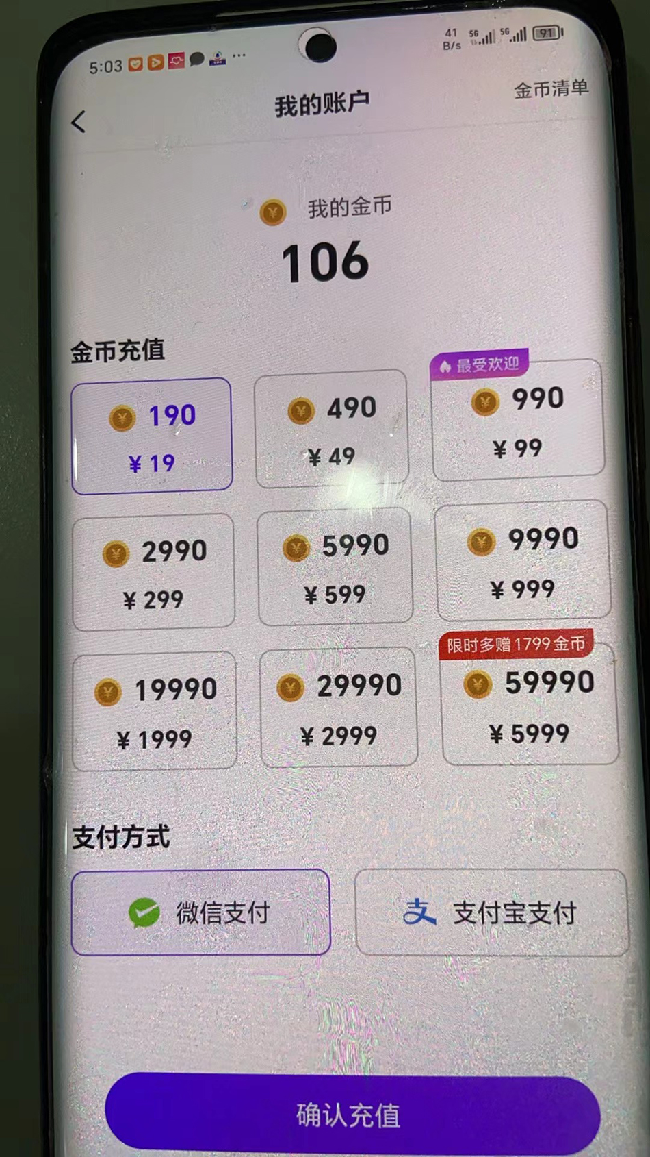 随后,该报在“陪伴”App实测中发现,使用赠送的虚拟金币后,消费者需要充值购买虚拟金币才能继续向聊天对象发送信息,充值金额最低为19元,最高为5999元,每1元对应10枚金币。
