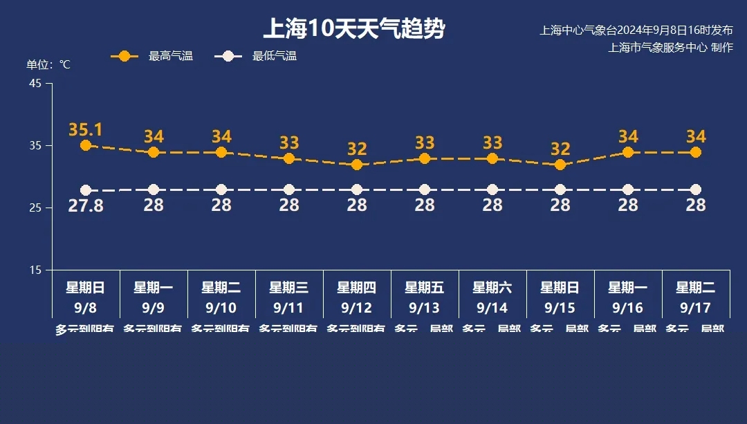 申城下周初的最高温度预计在34℃左右,仍有接触高温线的可能,防暑降温工作不宜懈怠。从周三开始,由于冷暖空气的共同影响,申城的天气变得多云多云,有时会有阵雨或雷雨,最高温度会回调到32~33℃,最终会稍微缓解一下热量。