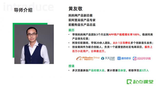 这个教学老师是为了 @有黄友敬老师,有 20 年度网络产品规划与管理经验,曾任阿里高级产品专家,酷狗产品总监,现就职妈妈网商品副总裁等岗位。