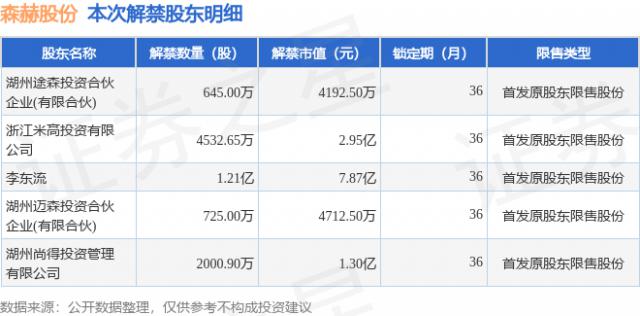 根据市场公开信息整理证券之星消息,森赫股权(301056)于 9 月 9 日将有 2.0 解禁一亿股限售股份,为公司首发原股东限售股份,占公司总股本。 75.0%的数据是根据历史公告整理的。 , 具体情况以上市公司最新公告为准)解禁后,公司已无限期出售股份。如图所示: