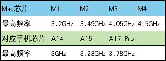 不只是骁龙,隔壁苹果的 M1 到 M4 芯片也在高频道路上飞奔,最新的 M4 已达到惊人的目标 4.5GHz ,随之而来的也是极限功耗猛增。