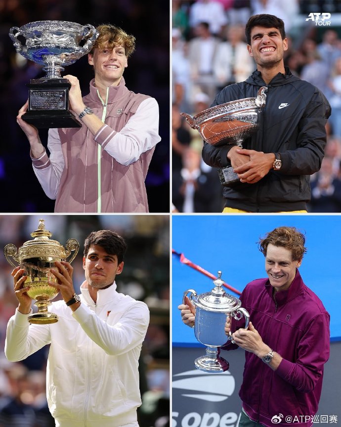 辛纳在今年的澳网半决赛中击败了德约科维奇,阿尔卡拉斯在温布尔登决赛中击败了塞尔维亚巨星,成为历史上最年轻的男选手,他们收集了硬地、草坪和红土大满贯。