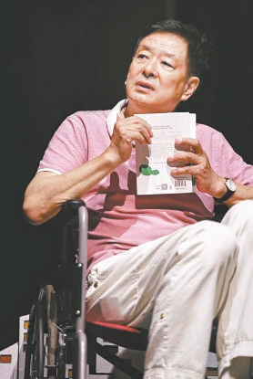 濮存昕坐在轮椅上读着史铁生的作品《病隙碎笔》。