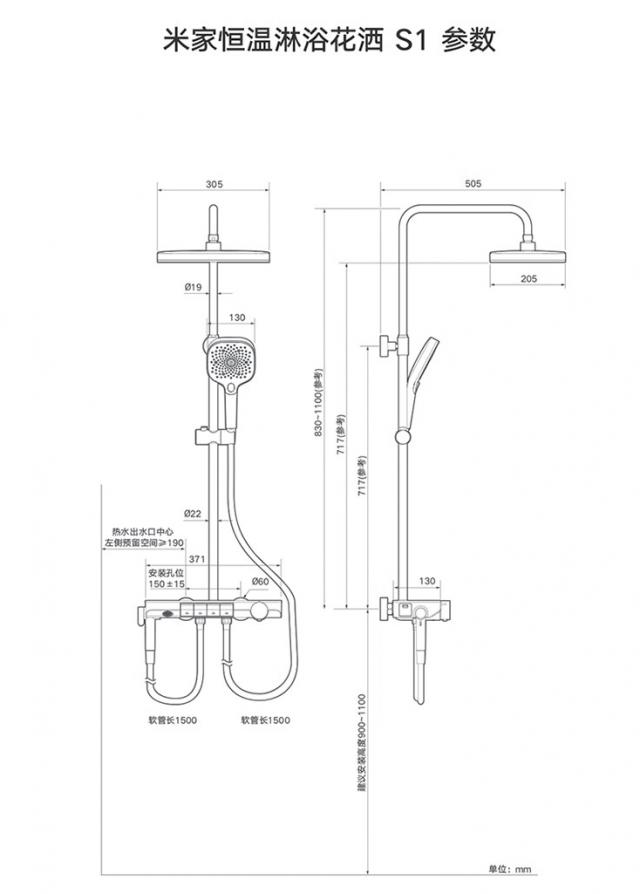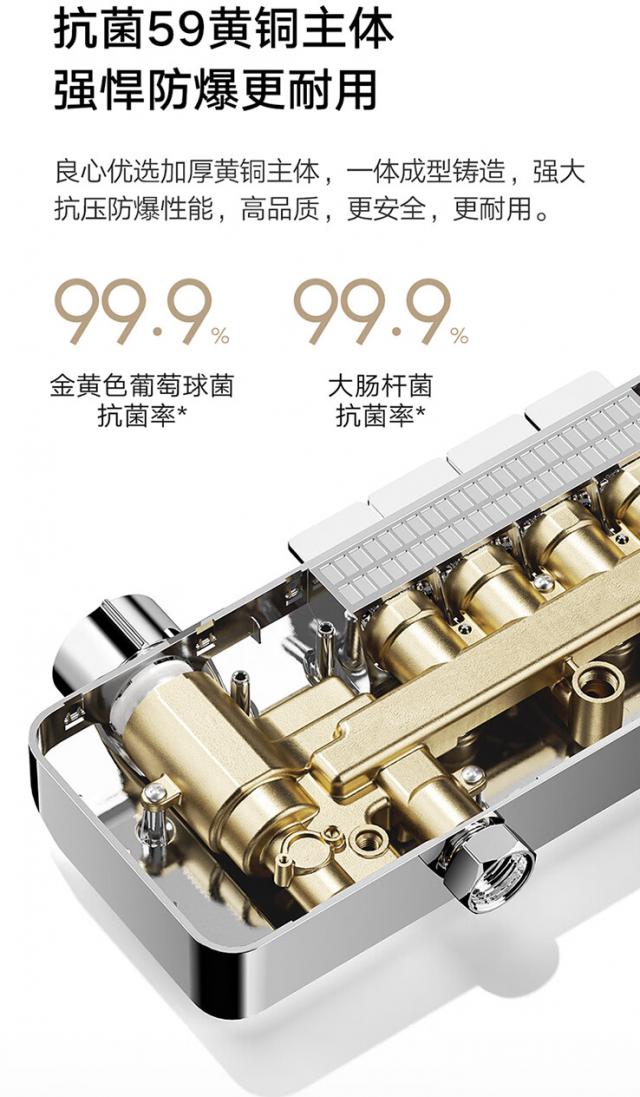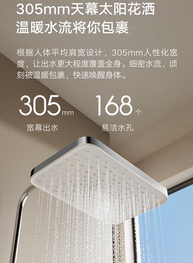 米家恒温淋浴淋浴 S1 选用抑菌 59 黄铜主体,由 305mm 天慕太阳花洒和 130mm 增压手持式淋浴结构,配有可调升降结构,可根据不同的使用习惯自由调节手持式淋浴高度和视角。