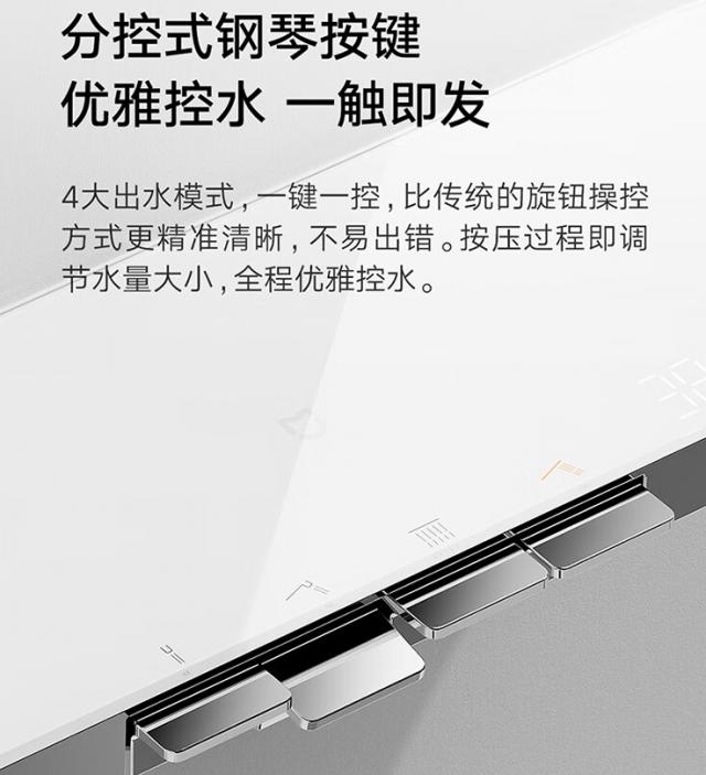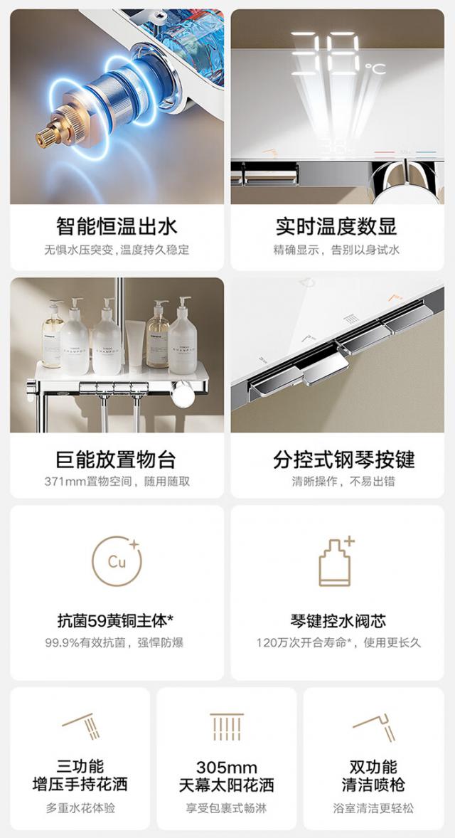 这个淋浴器也配备了 371mm 防烫置物台、钢化玻璃面板和分控钢琴按钮支持增压手持淋浴出水,太阳淋浴出水畅快,双功能喷枪出水,隐藏式防溅出水。 4 种出水方式,一键一控。