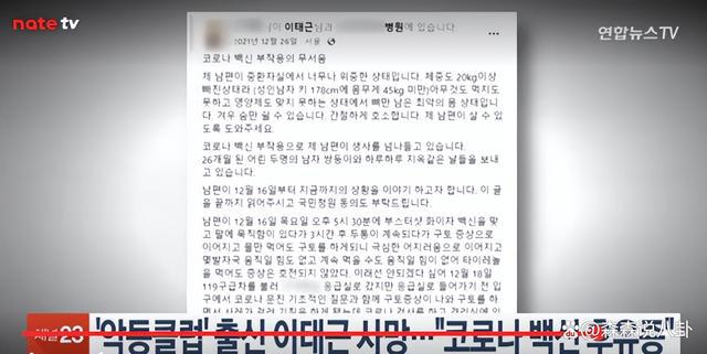 妻子在文章中抱怨,李太根于 2021 年 12 每月接种辉瑞疫苗增加剂(强化针), 2小时后出现头痛、呕吐等症状, 天后被送往医院 ICU,确诊蜘蛛网膜下腔出血,所以不能进食,体重暴跌。 20 KG,呼吸不畅取决于仪器的续命。