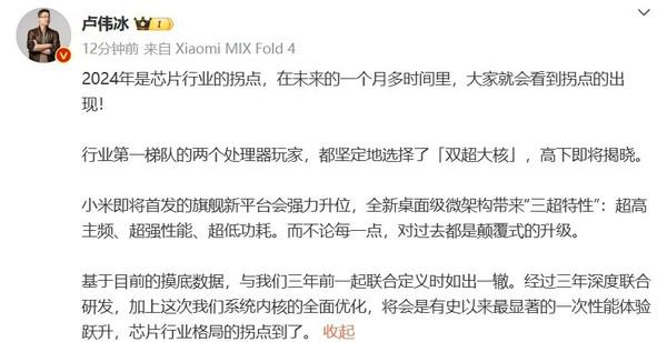 【CNMO 科技消息】9 月 9 早些时候,小米集团合作伙伴、总裁、国际部总裁、小米品牌总经理卢伟冰发微博称,2024 2008年是芯片行业的转折点。在接下来的一个月左右,每个人都会看到拐点的出现。行业第一梯队的两位Cpu玩家都坚定地选择了。「双超大核」,高下即将揭晓。