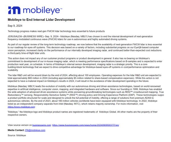 Mobileye 本计划于今年年底关闭激光雷达研发部门,预计此举将影响约会。 100 名员工。
