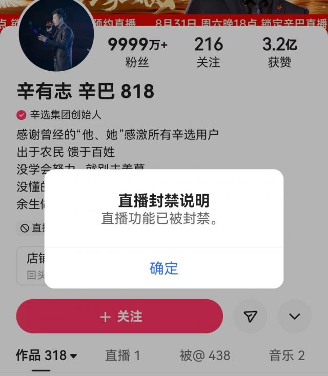 9 月 11 日本,记者查询辛巴的快手账号发现,它的主页显示直播功能已经被禁止,但是它的抖音平台的直播功能并没有受到影响。对于这一点,辛选集团没有给出回应。