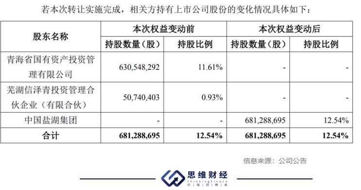 如果此次转让完成,盐湖股权控股股东大会将从青海国投调整为中国盐湖,公司实际控制人将由青海省政府国有资产监督管理委员会调整为中国五矿。公司表示,此次权益变动的目的是加快创建世界级盐湖产业基地,建设世界级盐湖产业集团。