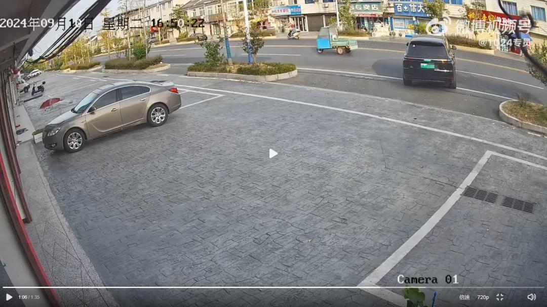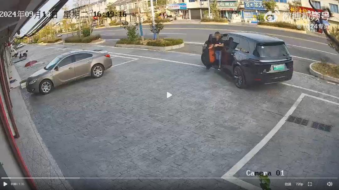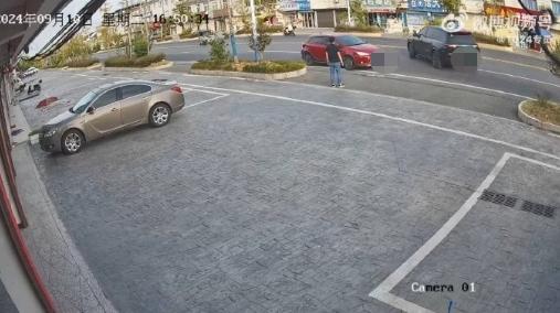这时,事故发生了,这辆车直接重新开出停车位,甚至给出停车场,开到双车道路中间;