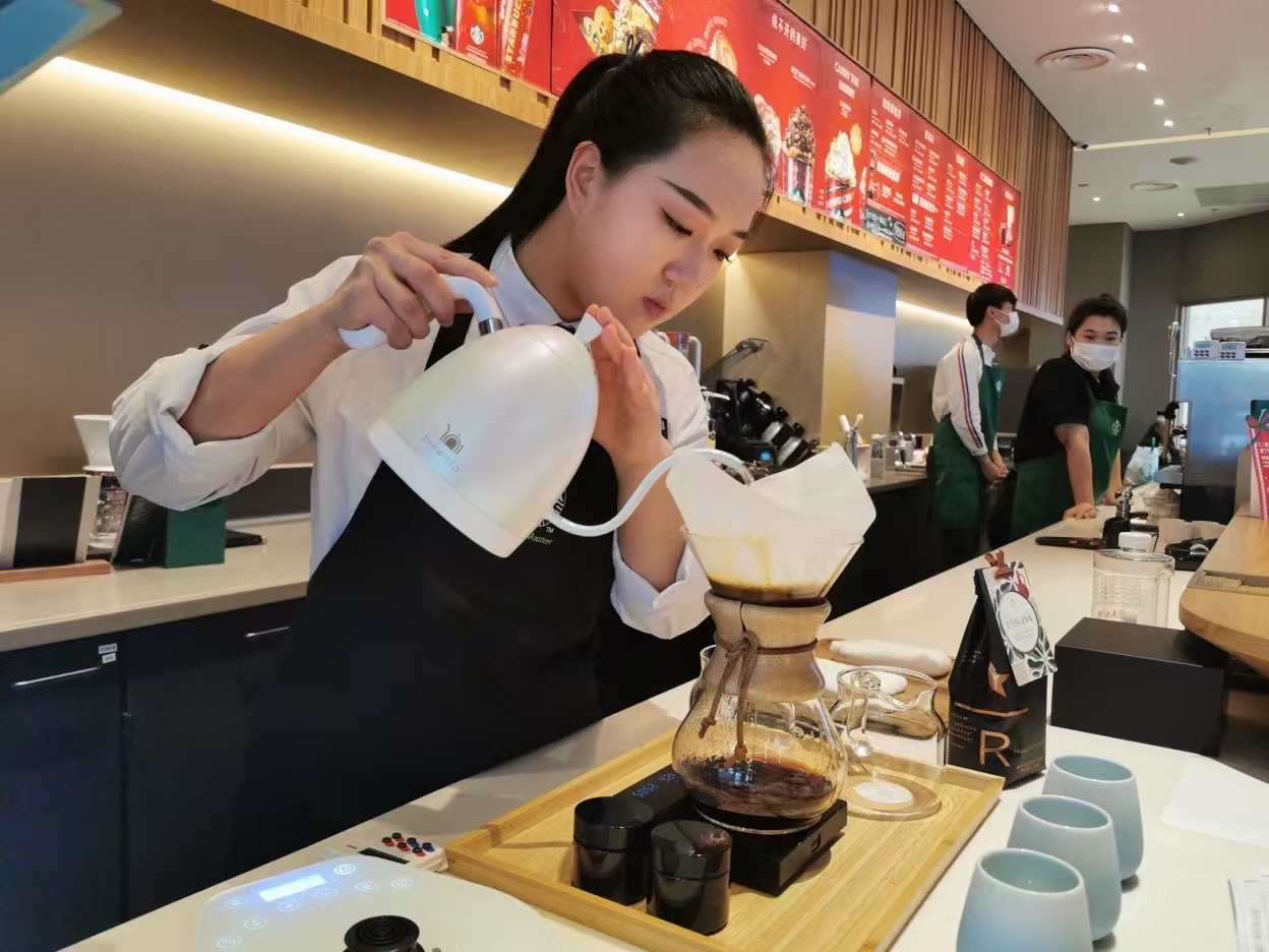 在星巴克中国咖啡创新产业园咖啡体验中心,徐雨欣与合作伙伴在