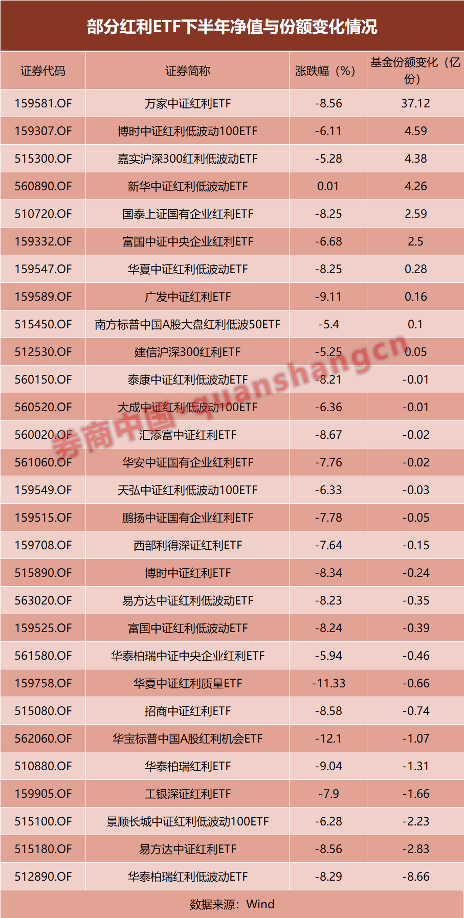 从长远来看,下半年以来,只有ETF净值大幅下降,包括在内的29款产品平均跌幅高达7.5%。但在此期间,市民们相当坚持,很少出现大幅赎回的迹象,甚至出现越跌越买的情况。例如,万家中证红利ETF份额增加了37亿份,博时中证红利下跌了100个ETF份额、嘉实沪深300红利低起伏ETF和新华CSI红利低起伏ETF的份额增加了4亿多份,而华泰柏瑞红利低起伏ETF的份额减少了8.66亿份,但对其之前近87亿份的规模影响有限。