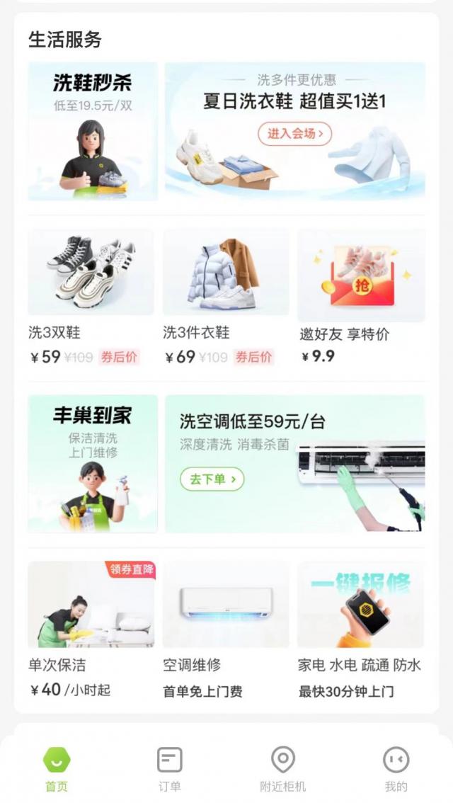 现在打开丰巢小程序,首页不仅有邮寄包,还有洗衣、洗鞋、清洁、大修,全屏都是各种生活服务的限时秒杀。