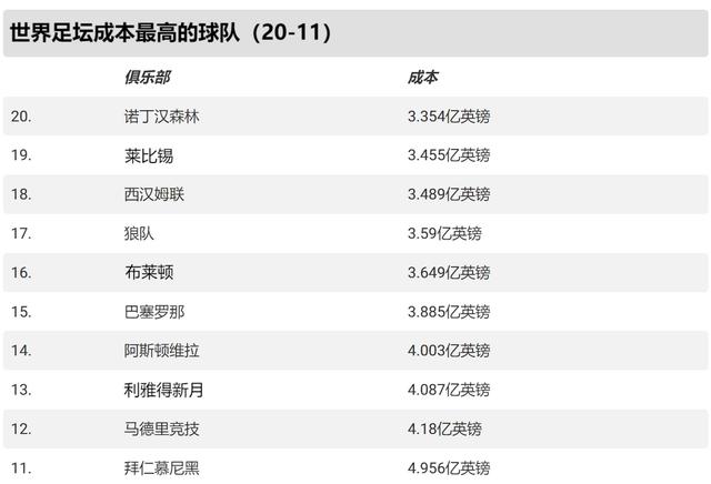 诺丁汉森林排名第一 20 位置,这意味着这支球队从重返顶级联赛到现在联赛排名从来没有超过第一名。 16 位英超球队的阵容比前三届意甲冠军还要贵。RB 尽管他们在今年夏天失去了明星球员达尼,但莱比锡是第二支支出。 · 奥尔莫,他们的阵容建设成本仍然很高。 3.455 亿英镑。