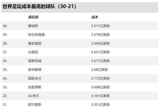 在这份榜单中,排名第一。 30 他们的阵容建设成本是摩纳哥。 2.511 1亿英镑,紧跟这支法甲球队后,是由布伦特福德、南安普顿、水晶宫和莱斯特城组成的英超联赛半决赛。如果纯粹是从球队的成本来看,他们可以在欧洲比赛中获得资格,但现在他们只能努力晋级。排名第 25 德甲雄师多特蒙德,他们的阵容建立费用是多特蒙德 2.68 亿英镑。