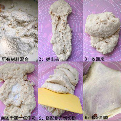 2、除了黄油以外的所有材料混合, ‼️出膜技巧(参照照片):用手搓面团,就像用搓板搓衣服一样(搓出来收回来),中间可以用刮刀切割。 ‼️揉捏时感觉面团干燥,可少倒些牛奶或水,慢慢揉捏面团。 直至揉出厚膜