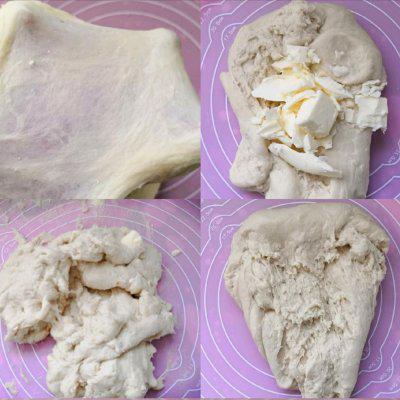 3、揉捏厚膜,然后加入黄油,加入黄油就会变成烂泥,继续揉捏。
