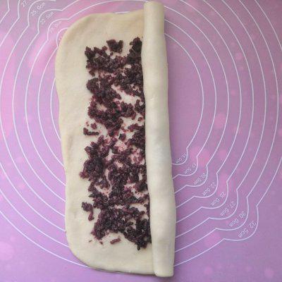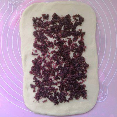 6、取一块面团擀成长方形,光滑面朝下,涂上糯米馅