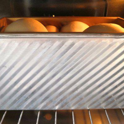 10、将整形面团放入吐司盒中,可以在不插电的烤箱中醒来,旁边放一碗热水增加湿度(如果有醒发箱,忽略这一步,直接放入醒发箱中加入酒精)。