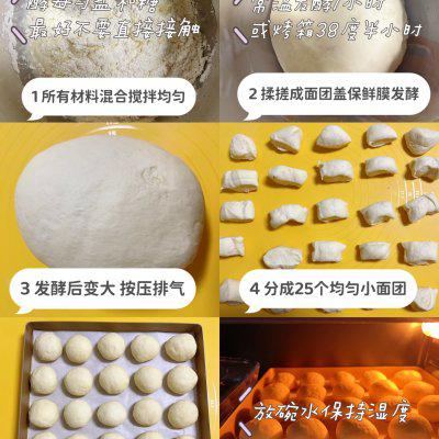 2、1 ⃣️一发: 将所有成分混合在一起,揉成面团,盖上保鲜袋,使其醇厚(常温醇厚) 1 小时或烤箱 38 度半小时 ) 。 小提示: ✨在放入面粉之前,酵母最好先混合在牛奶中,以免与盐和糖接触。✨ ✨糖可以根据爱好调节,可以减少到 20g 上下(不太甜)✨ 2 ⃣️二发: 发酵后增大,取出轻按排气,分为 25 一个匀称的小面团,在烤盘里揉捏光滑。烤箱发酵 38 度 1 一小时(放入碗水保持湿度),发酵至两倍大粘连即可。