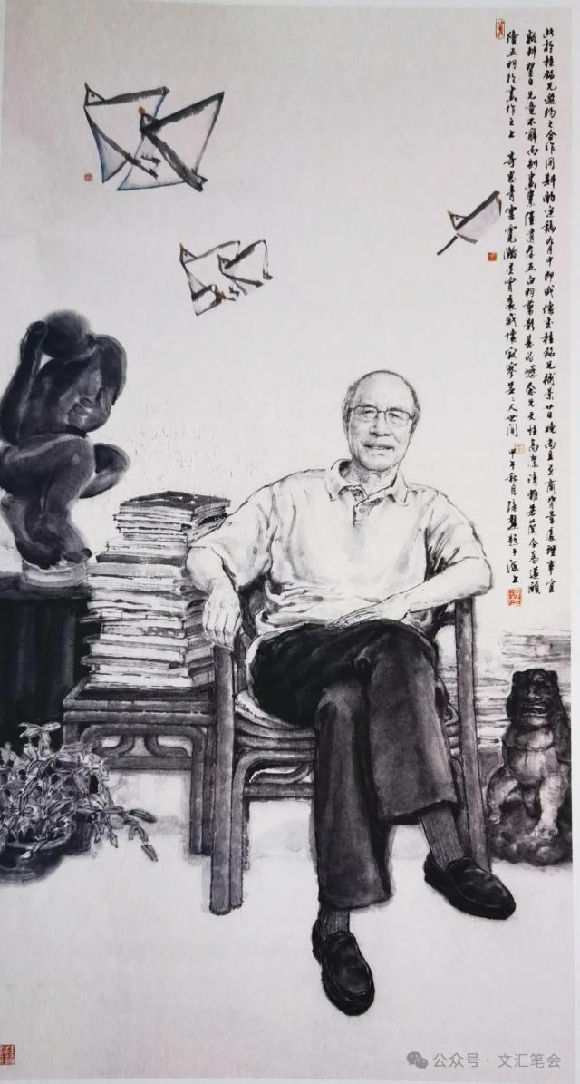 在《惊艳——张桂铭艺术回顾展》的最后,有一幅“张桂铭先生的雕像”(与张培基合作,下图),这是一幅充满悲伤叙事的画。张培基是张桂铭的朋友,应张桂铭的邀请,为他画了一幅画像,画面中张桂铭端坐在红木圈椅上,画笔细致,形神兼备。特别是张桂铭的眼神很有内涵,仿佛凝视着,仿佛在思考。在张桂铭椅边的茶几上,堆着一大堆厚厚的书,他平时最大的爱好就是读书。张培础于 2014 年 9 月 20 日画完这幅肖像后,交给张桂铭补景,但遗憾的是,张桂铭却于于于 9 月 22 早上回到道山。在张桂铭的画桌上,张培基发现了五只张桂铭画的和平鸽,并且被剪成了样品。原来,张桂铭的创作一直都很严谨,有时候他会把要画的图像剪掉,然后试着把它放在画面上看效果。所以,张培基只能按照老朋友的想法,含泪将和平鸽移到这幅画的上面。