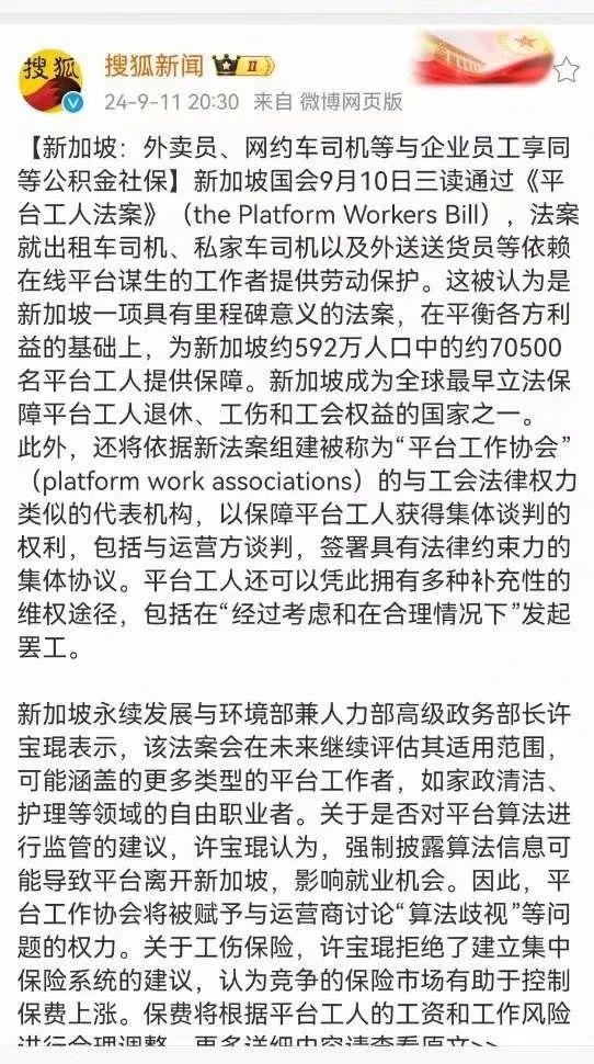 新加坡国会 9 月 10 通过《平台工人法》,法案为依靠在线平台谋生的工人提供劳动防护,如出租车司机、私家车司机和送货员(统称平台工人)。