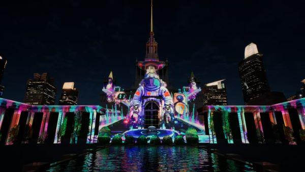 夜幕降临时,上海展览中心的建筑外墙将成为建筑投影秀的幕布,南广场轮流展示“循光” · 以光年为主题的建筑投影秀——探索时空之境,绽放光影之美。 4 分钟。