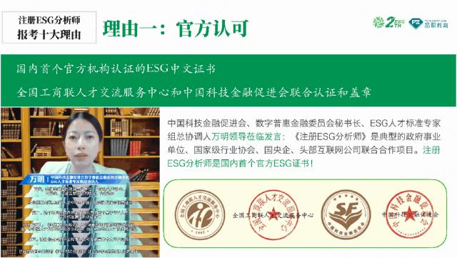 要积极配合国内对 ESG 人才需求,去年,中国工商联人才交流服务中心和中国科技金融促进会在中国正式推出。 ESG 证书,也是中文版的 ESG 证书,即注册 ESG 分析师。