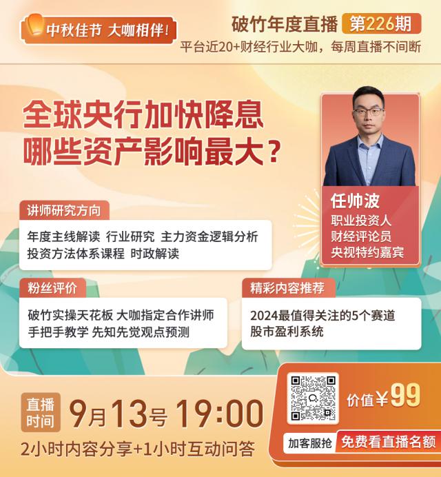今晚 7 点,应破竹邀请,职业投资者,央视证券信息频道特约嘉宾,任帅波先生为大家带来一场名为“破竹”的直播间。《哪些资产对全球央行加速降息影响最大?》主题直播。欢迎大家到直播间进行交流。