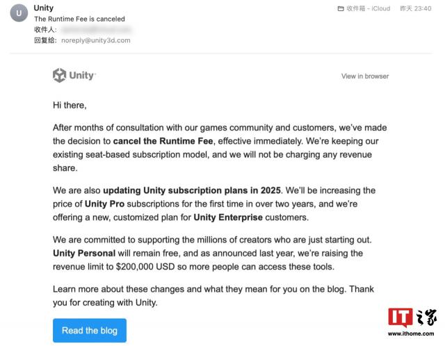 IT 世家 9 月 13 每日消息,游戏引擎开发商 Unity 在去年 9 月宣布自 2024 年 1 月 1 日起向开发商收取“运营费”,但根据 Unity 今日发布的邮件,目前,该公司已全面取消这一“运行费”政策。