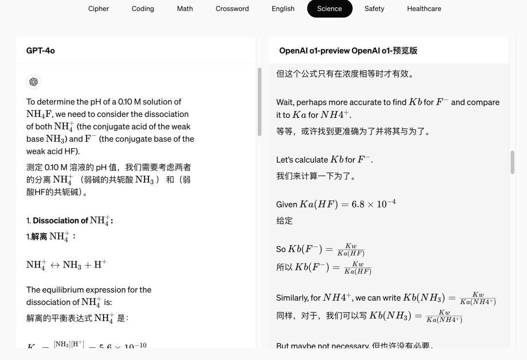 另外一个例子,在处理化学问题时,我们可以看到 o1 模型甚至自己都在选择多种方案进行比较。