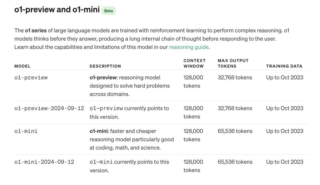 在 OpenAI 在网页上可以看到模型介绍, o1 模型训练数据截止日期为去年10月,最早的是 Q*这个项目的爆料,大概是在去年十一月份。