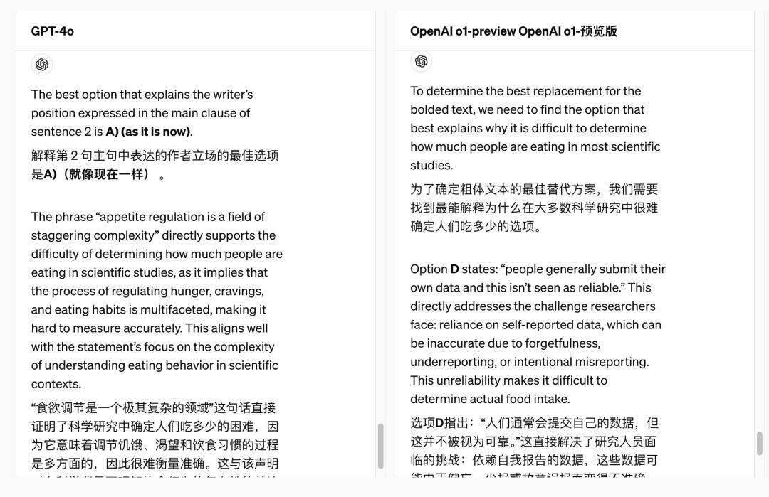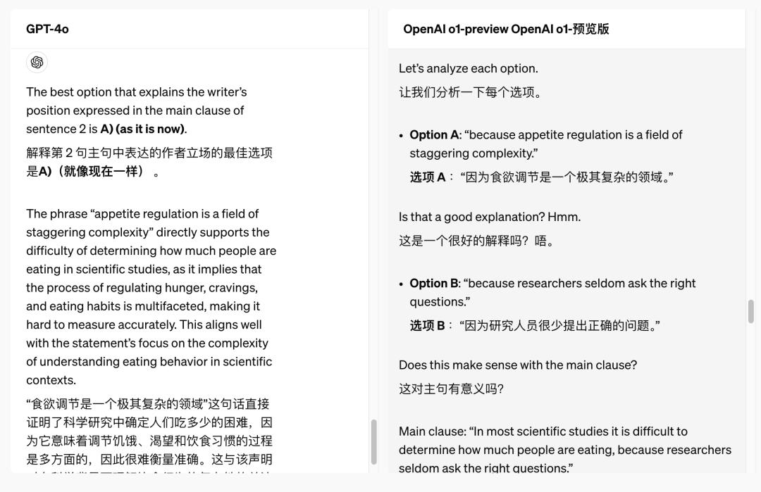 在 OpenAI 给予案例。GPT-4o 和 o1 模型同时回答同一个问题——读一篇长文,然后做阅读理解。 o1 在模型中,会有另外一个选项叫做思维链。