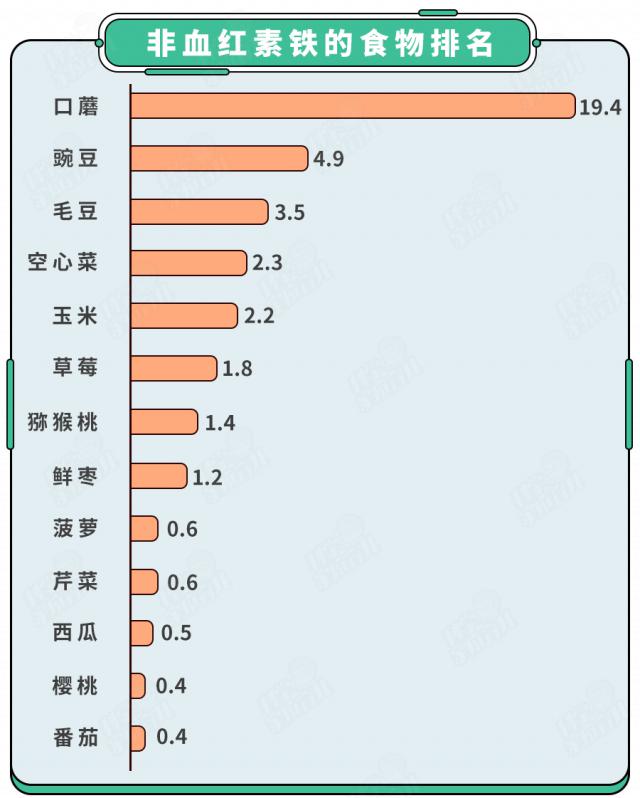 第二,有效吸收率为 2%~20%的非血红素铁,主要存在于植物中,是一些常见的水果和蔬菜。