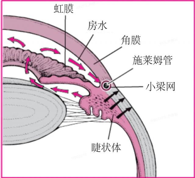 房水是人眼内部的低粘度液体,持续分泌和重吸收。这两个过程之间的平衡调节了眼睛内液体的体积和压力。 [ 8 ] 。一般来说,流入量和流出量是相等的,但是如果分泌和重吸收之间的平衡被打破,比如房水流出时遇到阻碍,眼压就会升高,造成眼睛不适。 [ 8 ] [ 9 ] 。