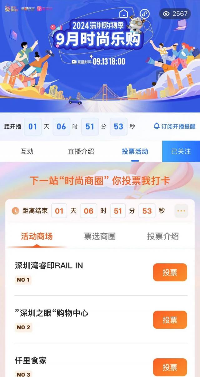 这次直播设置好了 6 一个热门商圈的投票环节,9 月 13 日 18:30 欢迎参加“你投票我打卡”互动,投票给热爱活力的商圈。直播期间,我们将根据最终票数选择前三大商业区进行实地考察。快来。 pick 您喜欢的商圈吧!