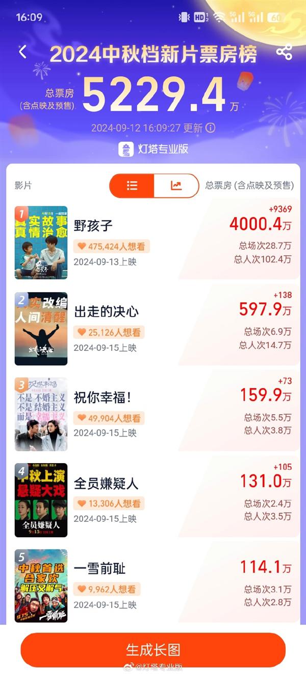 在这些人中,《野孩子》《出走的决心》《祝你幸福!目前中秋新片预售票房排名前三。