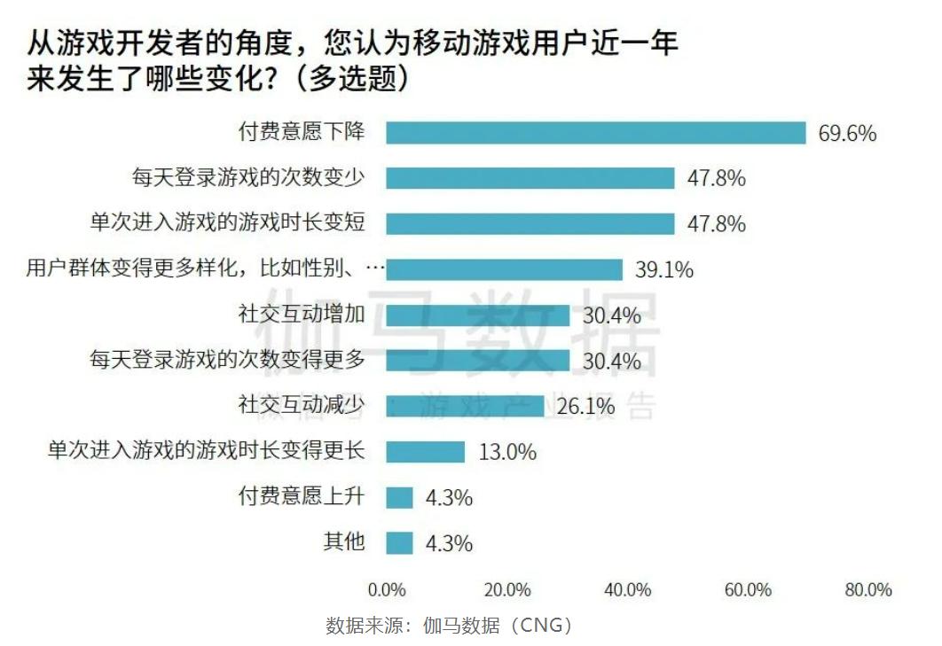 根据开发者的调查数据,69.6%的开发者认为移动游戏用户的支付意愿在过去一年中有所下降。与此同时,47.8%的开发者认为用户在日常登录次数和一次游戏时间方面的活跃度降低,客观情况直接影响了二游过去引以为豪的氪金抽卡支付模式。因此,我们看到了《原神》四年来的第一次降价。