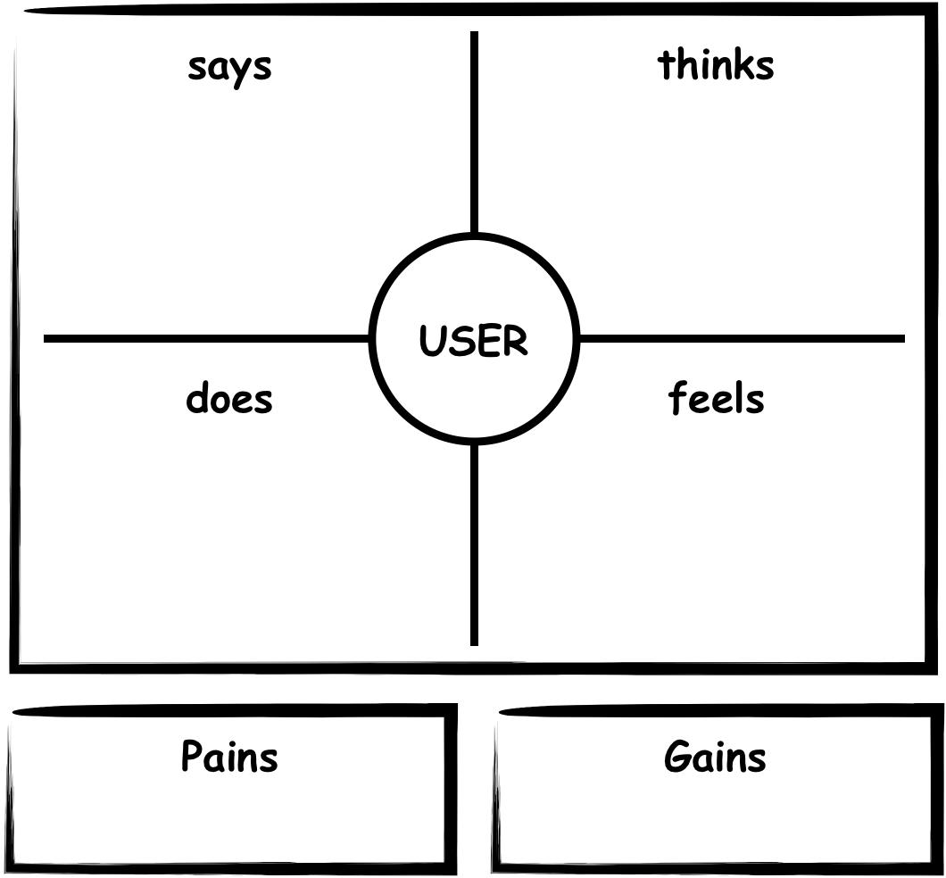 1.在你的白板上画一张地图。地图中心是用户,周围有四个象限,标有“说、想、做、感”。在正方形下面画两个长方形,一个写“烦恼”,一个写“得到”,如图所示。