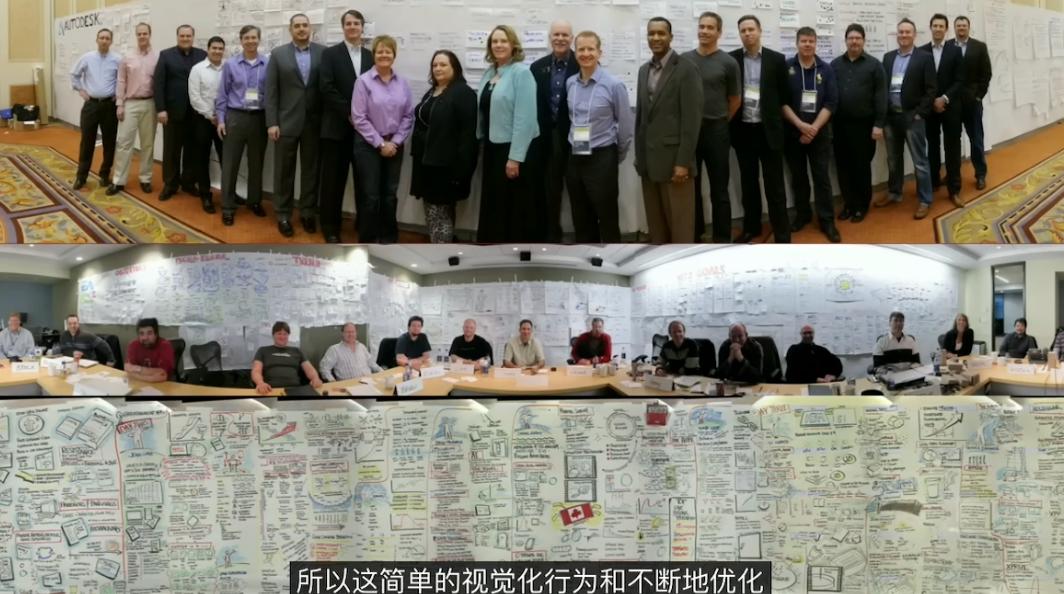 要是把这个逻辑运用到公司的管理工作中呢?比如公司愿景,用户体验,可持续发展等等。罗达尔组织的一个例子是一家大型出版公司。有一年,他们损失了很多钱。他们的执行团队花了三天时间可视化他们所有的经验。他们可视化所有企业后,系统不断叠加和整理。后来他们声明自己再次获得了5亿美元的利润,他们的客户评价也从D变成了A。