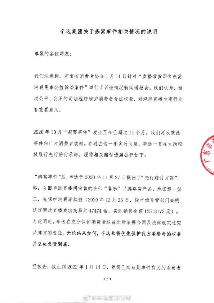 2020年,辛巴在直播中出售即食燕窝,受到消费者质疑。即食燕窝不符合燕窝的食用标准,本质上是一种风味饮料。