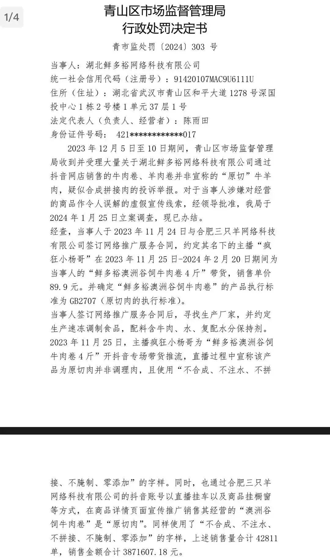 最近小杨哥因为带货的“鲜多裕”牛肉卷涉嫌虚假宣传而陷入舆论风波,其中商家已经被罚款50万元。但由于三只羊不在相关部门管辖范围内,处罚情况尚未确定。