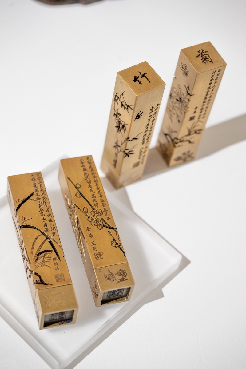 金全福呈现了四个香筒,主题为梅、兰、竹、菊。香筒周围雕刻着精美的图案,与诗歌相匹配,优雅精致。姚建萍的《秋山江阔图》是一幅苏绣,作品整体色彩优雅,构图长远宏伟。