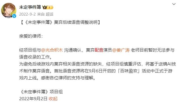 事实上,AI配声在B游市场并非没有例子。比如上面提到的“未确定事件簿”,莫毅CV姜广涛涉案后,米哈游直接用AI模拟姜广涛的声音。虽然前期人工智能配声的宣布存在诸多争议,但玩家在实施后其实很满意。