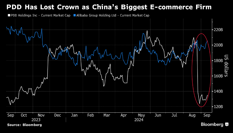 直到最近,拼多多仍然被认为是中国电子商务领域不可多得的亮点。在经济疲软的情况下,客户小心翼翼,企业以低价策略占据了份额,并通过Temu复制了自己在国外的成功。在过去的五年里,拼多多的股价仍然上涨了171%,在彭博中国大型科技股指数中名列前茅。