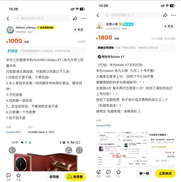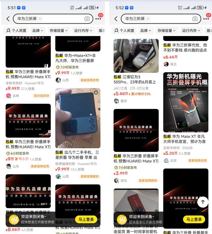 发布会结束后,华为官网显示,Mate 预约XT非凡大师的人数已经接近500万。在咸鱼平台上,Mate XT非凡大师已被炒成5-6万元,更多的商家开到10万元,溢价率接近5倍。而且有商家表示可以提供代抢服务,价格在1000元到2000元之间。