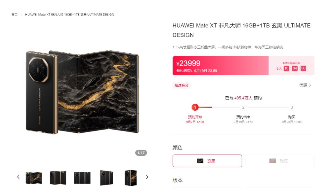 九月十日,华为正式向全球首款量产三折叠手机上市——Mate 非凡的XT大师。